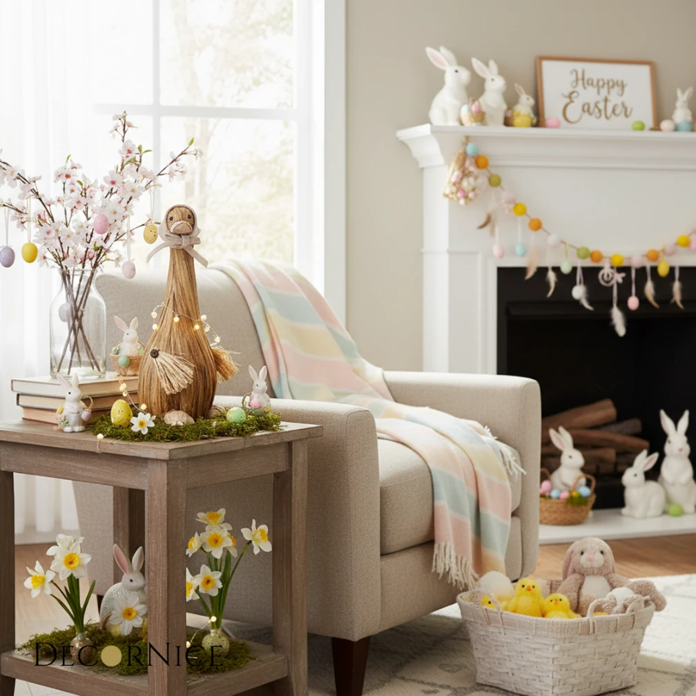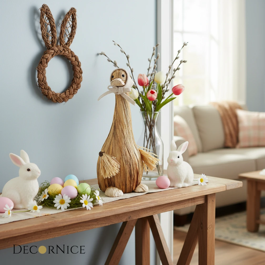 Figurka wyróżnia się starannym wykonaniem z juty, co nadaje jej autentycznego, ekologicznego charakteru. Uroku dodaje jej jasna chustka zawiązana pod szyją, która pięknie kontrastuje z naturalnym brązem tułowia. To subtelna, a zarazem efektowna ozdoba, która sprawdzi się zarówno na wielkanocnym stole, jak i jako całoroczny element wystroju kuchni czy salonu.